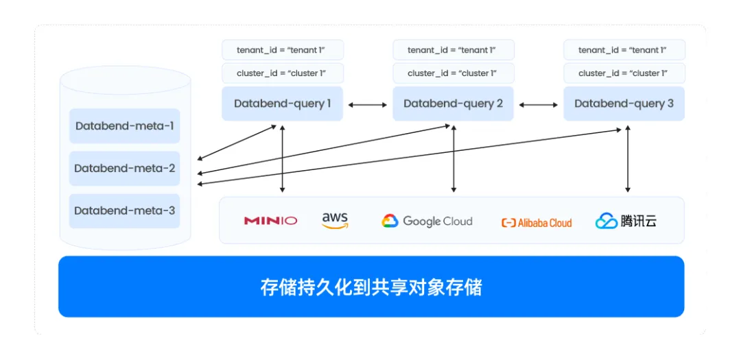 - databend-query 用于计算节点,通过配置标签决定其所属集群,目前也支持动态集群的创建及管理。