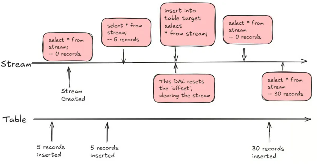 该 SQL 执行后,对应的 Stream 会指向后续的数据增量。