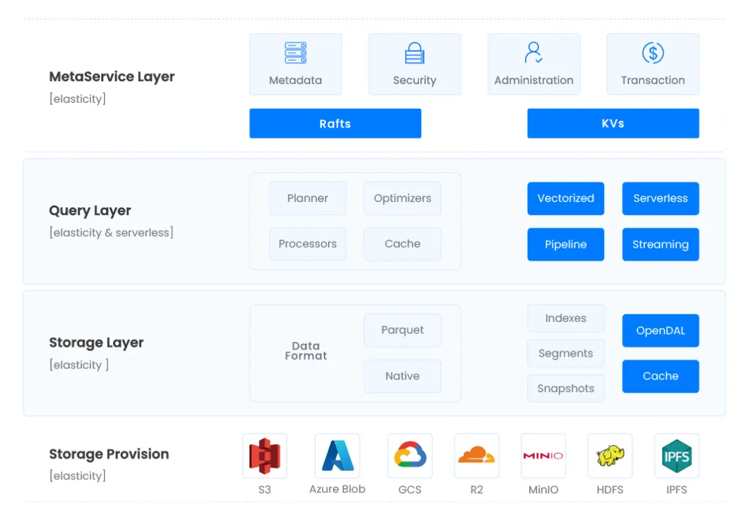 Databend 基于对象存储和 k8s 架构下开发的云原生数据平台,该产品使用 Rust 开发,注重平台的性能和安全性,以 SQL 为交互语言,支持海量存储和计算的数据平台。
