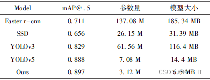 通过重新设计网络的骨干部分,使用ShuffleNetv2 Block替代特征提取部分,大大压缩了模型的计算量和参数量。在颈部部分采用加权双向特征金字塔网络,有效融合特征提取结果,提升了检测性能。引入坐标注意力机制,同时考虑通道信息和位置信息。改进后的模型相较于YOLOv5在平均精度、准确率、召回率方面有明显提升,同时在计算量和参数量上有显著降低。