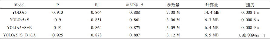 通过将轻量级网络ShuffleNetv2 Block替换YOLOv5的骨干网络,成功压缩了模型的参数量和计算量,分别达到了56.8%和56.3%的压缩比。尽管模型的P(查准率)、R(召回率)和mAP(平均精度)相比原网络略有降低,但在颈部部分使用BiFPN结构提高了网络的特征融合能力,并仅增加了少量参数,将模型的准确率、召回率和平均精度提高至原YOLOv5水平。