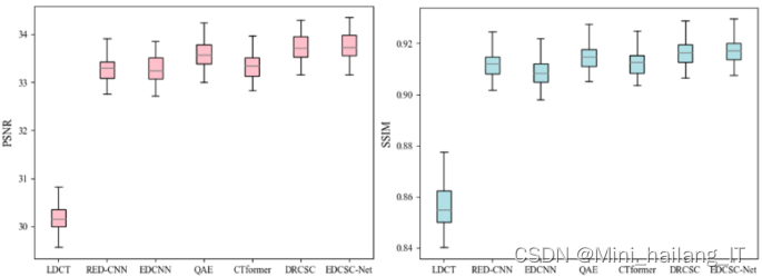 去噪方法在 AAPM 测试集上的箱型图展示了不同方法的性能分布情况,包括中位数、四分位数、最大值和最小值以及箱型图宽度。这些信息有助于比较和评估不同方法的优劣,以及选择适合特定应用场景的方法。