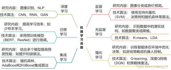 机器学习算法研究方向主要探索经典算法的优化与新型算法的设计。这一方向关注如何提升算法性能与训练效率,通过超参数调优、特征选择与模型集成等技术改进现有算法,同时研究适用于小样本学习、不平衡数据处理等特定场景的算法创新。具体可实现的功能包括图像分类模型优化、预测系统性能提升、异常检测算法改进等,常用技术框架涵盖支持向量机、随机森林、XGBoost等传统算法以及AutoML自动机器学习工具。通过这一方向的研究,同学们可以深入理解算法原理,掌握模型调优方法,培养解决实际问题的能力。