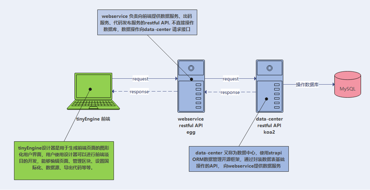 - TinyEngine 设计器微服务选择了基于 Node.js 的技术栈,为前端开发者提供了一致的开发体验,无需学习额外的语言即可全栈开发,降低了开发难度和学习曲线,避免了学习新语言的困扰。更能够从服务端的角度去理解 TinyEngine 设计器的运行原理与设计思想。