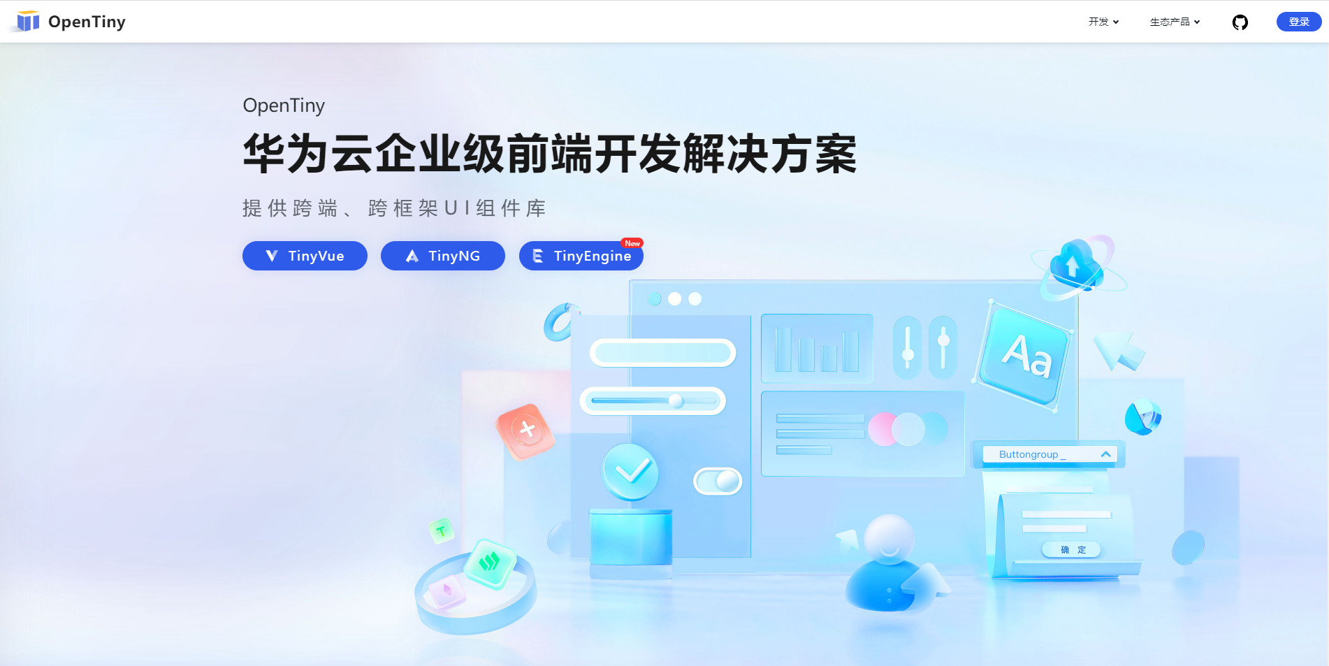 OpenTiny 是一套企业级 Web 前端开发解决方案,提供跨端、跨框架、跨版本的 TinyVue 组件库,包含基于 Angular+TypeScript 的 TinyNG 组件库,拥有灵活扩展的低代码引擎 TinyEngine,具备主题配置系统 TinyTheme / 中后台模板 TinyPro/ TinyCLI 命令行等丰富的效率提升工具,可帮助开发者高效开发 Web 应用。