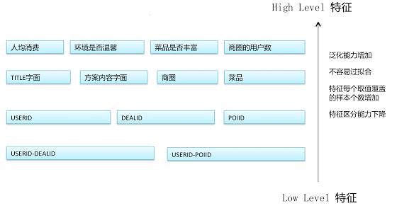 基于上面的数据,可以抽到两种特征,POI(门店)或人均消费;POI特征则是Low Level特征,人均消费则是High Level特征;假设模型通过学习,获得如下预估: