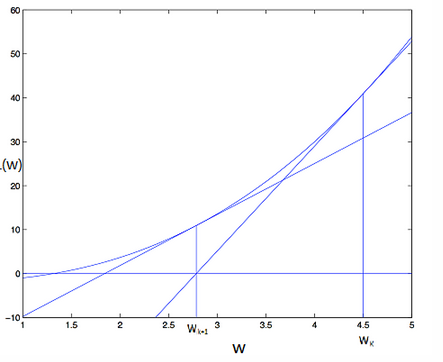 牛顿法的基本思想是在极小点附近通过对目标函数做二阶Taylor展开,进而找到L(w)的极小点的估计值。形象地讲,在wk处做切线,该切线与L(w)=0的交点即为下一个迭代点wk+1(示意图如下)。w的更新公式如下,其中目标函数的二阶偏导数,即为大名鼎鼎的Hessian矩阵。