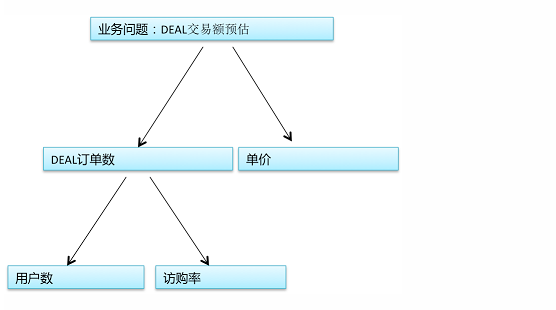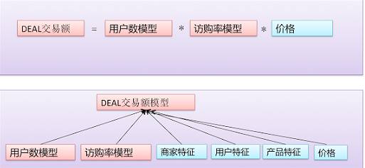 按照上图进行拆解后,预估DEAL交易额就有2种可能模式,一种是直接预估交易额;另一种是预估各子问题,如建立一个用户数模型和建立一个访购率模型(访问这个DEAL的用户会购买的单子数),再基于这些子问题的预估值计算交易额。