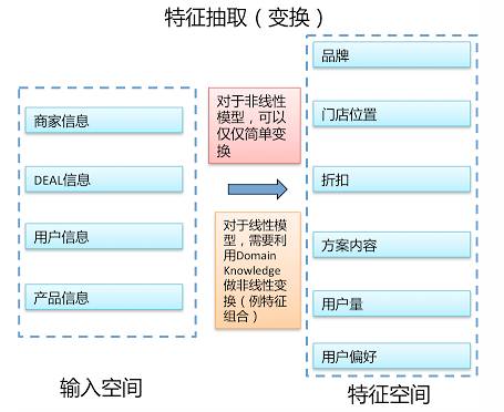完成数据筛选和清洗后,就需要对数据抽取特征,就是完成输入空间到特征空间的转换(见下图)。针对线性模型或非线性模型需要进行不同特征抽取,线性模型需要更多特征抽取工作和技巧,而非线性模型对特征抽取要求相对较低。