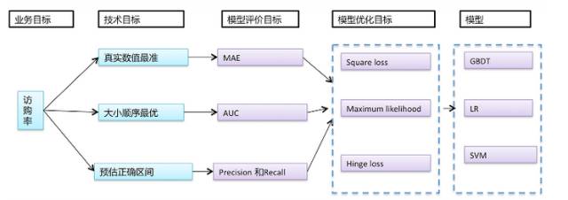为实际问题选择模型,需要转化问题的业务目标为模型评价目标,转化模型评价目标为模型优化目标;根据业务的不同目标,选择合适的模型,具体关系如下: