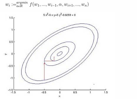 对于w,每次迭代,固定其他维度不变,只对其一个维度进行搜索,确定最优下降方向(示意图如下),公式表达如下: