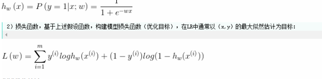 模型,是机器学习中的一个重要概念,简单的讲,指特征空间到输出空间的映射;一般由模型的假设函数和参数w组成(下面公式就是Logistic Regression模型的一种表达,在训练模型的章节做稍详细的解释);一个模型的假设空间(hypothesis space),指给定模型所有可能w对应的输出空间组成的集合。工业界常用的模型有Logistic Regression(简称LR)、Gradient Boosting Decision Tree(简称GBDT)、Support Vector Machine(简称SVM)、Deep Neural Network(简称DNN)等。