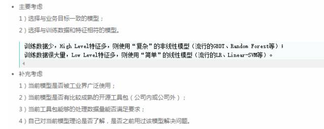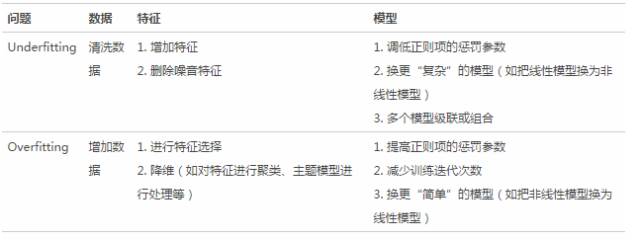 针对不同业务目标、不同数据和特征,选择不同的模型;如果模型不符合预期,一定检查一下数据、特征、模型等处理环节是否有bug;考虑模型Underfitting和Qverfitting,针对性地优化。