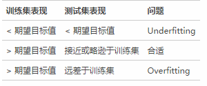 在实战中,可以基于模型在训练集和测试集上的表现来确定当前模型到底是Underfitting还是Overfitting,判断方式如下表:
