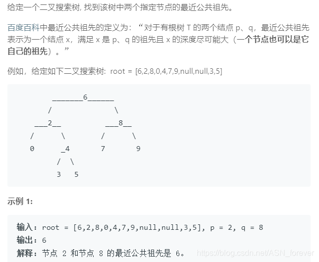 知道了二叉搜索树的性质后,根据其性质可知,如果p和q在节点temp的两侧的话,也就是当(p.val - temp.val)*(q.val - temp.val)<=0时(包含“=”号,因为“一个节点也可以是它自己的祖先”),则当前节点temp就是它们的最近公共祖先。否则说明p和q都在temp的某一侧,如果在左侧的话,那么就让temp = temp.left,循环递进比较即可。