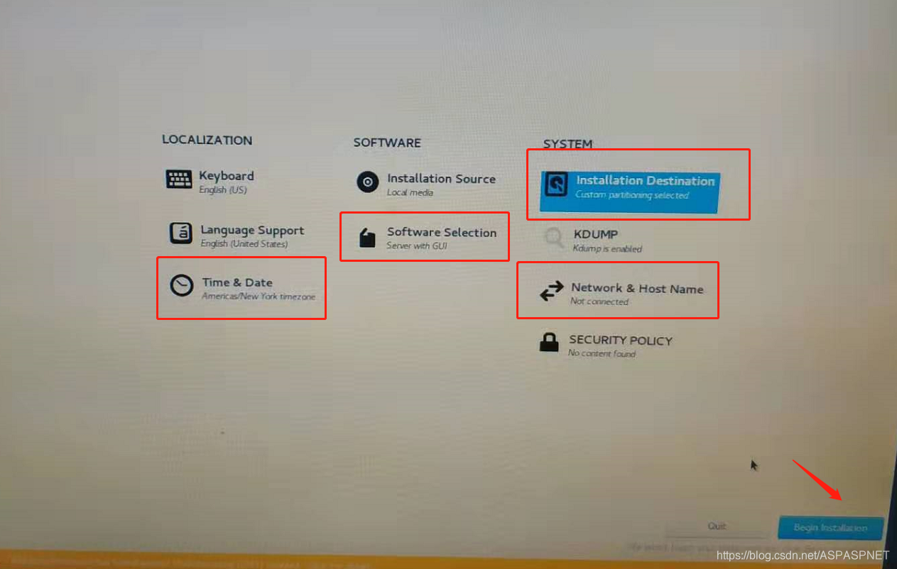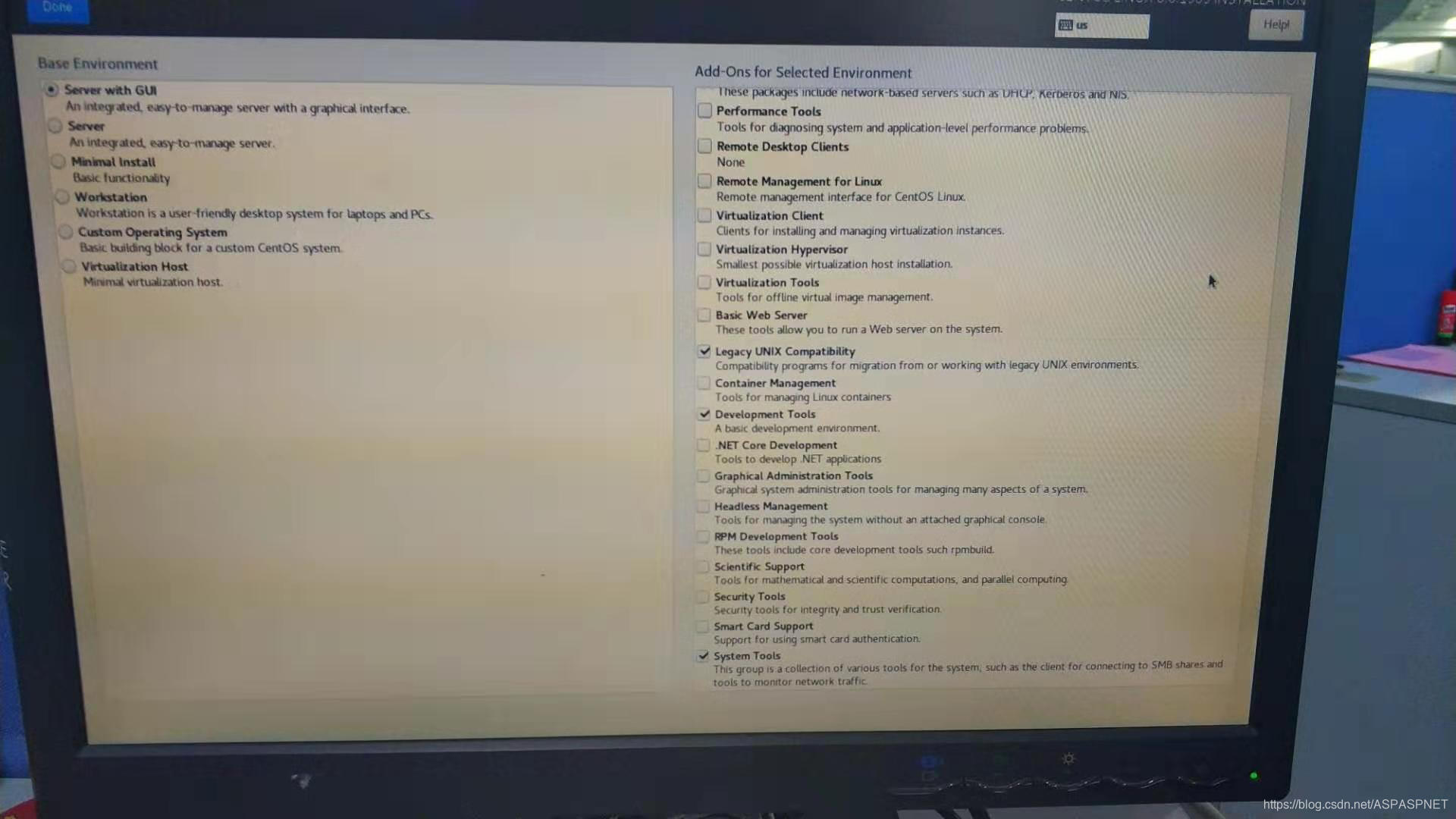 - 系统建议选minimal install,再加部分工具,初学直接选图形(作为服务器的话,图形其实没什么用)。