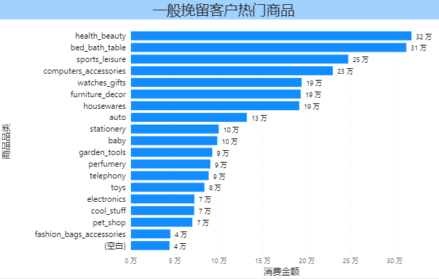 2)大众热门品类集中在健康美容、家居用品、运动休闲。 主要用户的热门商品品类中,健康美容、家居用品、运动休闲等品类均出现在热门排名前列,说明这类商品是大众热门品类,适合对各类用户做推广和促销; 手表、家具、电脑配件则属于小众热门商品,对特定类型用户来说更受欢迎,可选择合适的用户群体进行推荐。