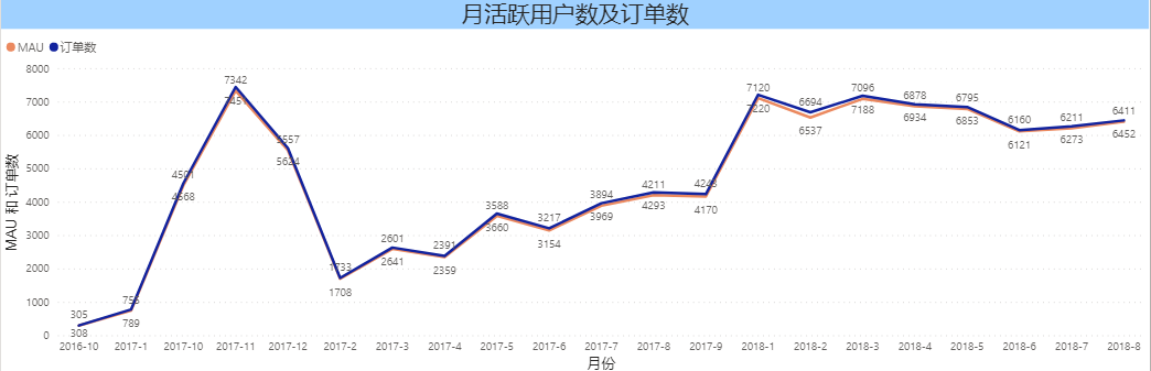 FROM (SELECT y '年',m '月',count(DISTINCT customer_unique_id)MAU FROM order_detail GROUP BY y,m ORDER BY y,m)a