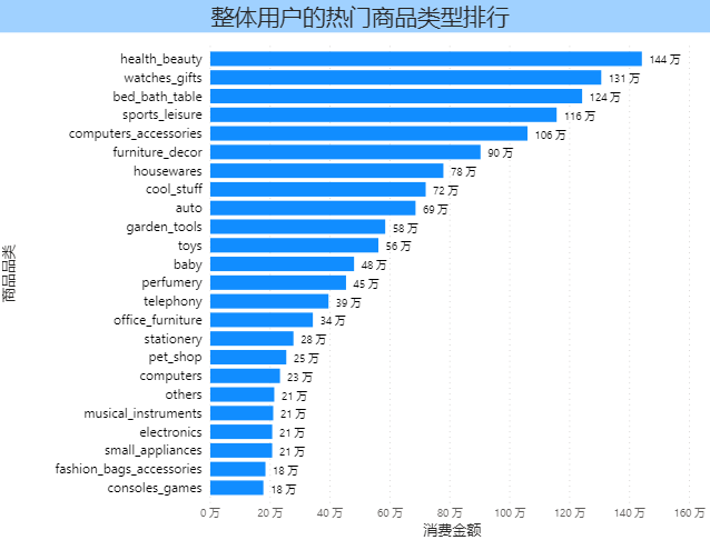 SELECT product_category_name_english 商品品类,round(sum(value_sum),0) 消费金额,ROW_NUMBER()over(ORDER BY round(sum(value_sum),0) desc)as rk