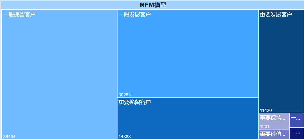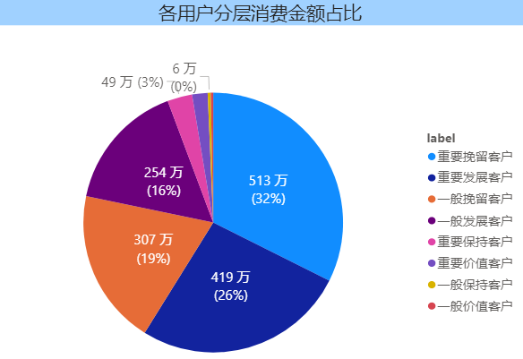 1)平台30%的用户贡献60%的销售额,符合电商行业的二八原则。 从用户数量来看:重要发展用户、重要挽留用户、重要价值用户的比例不到30%,明显低于一般发展用户和一般挽留用户的70%比例; 从消费金额来看:重要发展用户和重要挽留用户的消费金额占全体用户的58.85%,一般发展用户和一般挽留用户的消费金额占全体用户的35.45%。这说明: