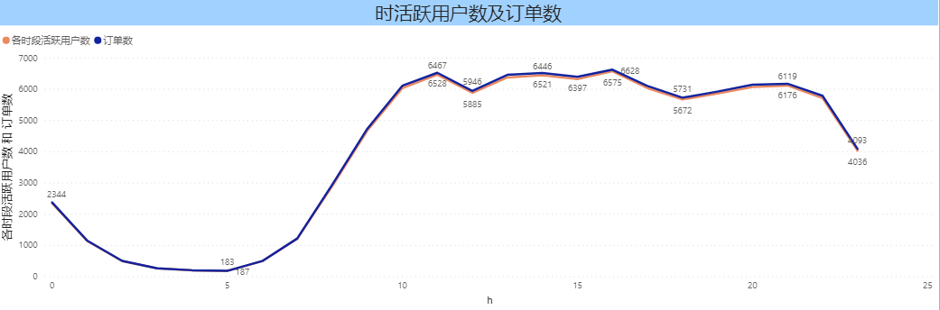 3)各时段活跃用户数高峰值集中在10 am-10 pm。 10 am-10 pm的用户数和订单数明显高于平均水平,是用户活跃时段,其中12点和18点推测由于饭点时间导致活跃度略有下滑。22点-次日5点是用户的睡眠时间,活跃用户数处于低点,之后5-10点开始回升,直到10点后恢复到活跃水平。 运营人员可以根据活跃用户的时间段,采取促销措施。
