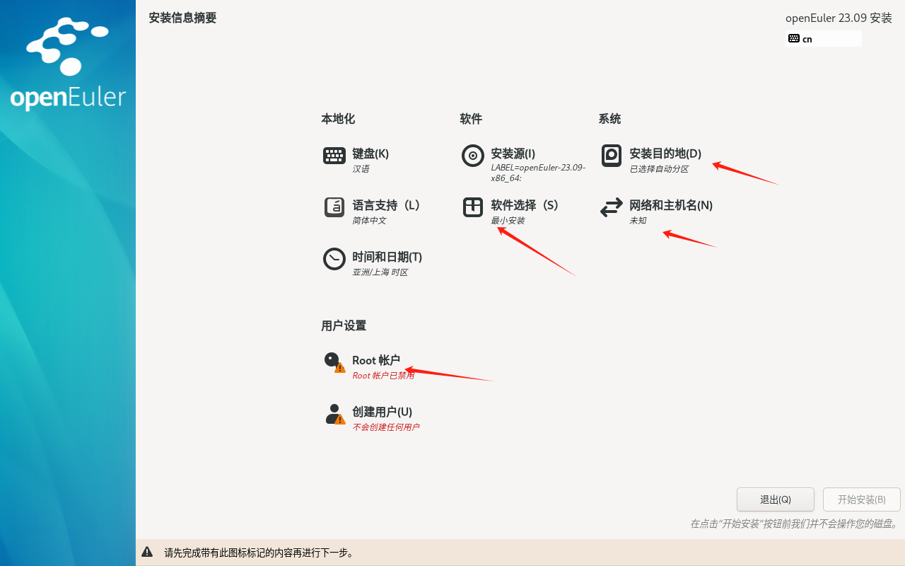 选择语言,创建硬盘分区,选择最小安装,设置网络主机与服务器,创建root账户,等待安装完成,进入系统。