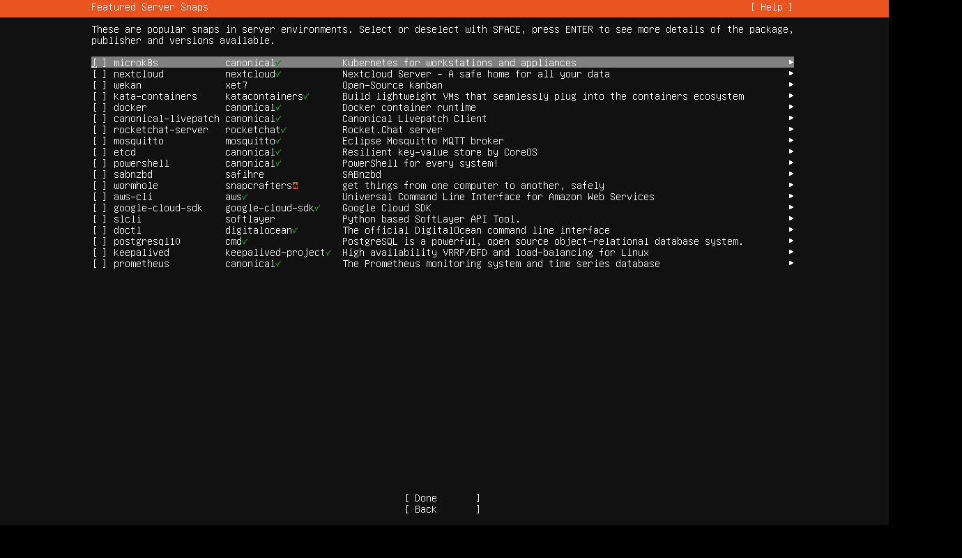 你可以选用你的ubantu可用软件包列表,它们将与服务器一同安装,你也可以使用空格键来取消选用,也可以查看详细信息直到下一步。