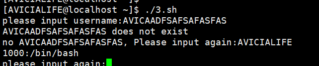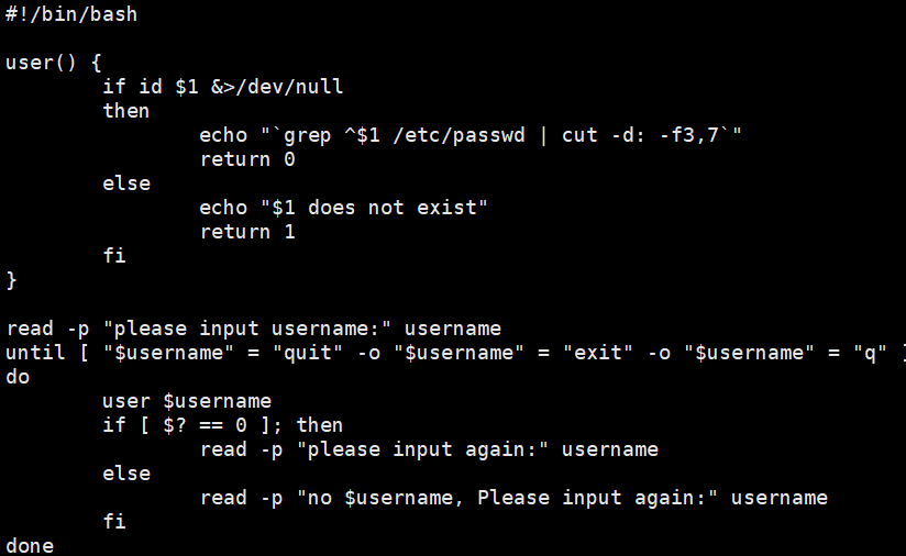 利用user函数完成主要功能 read作为二级提示语引导用户完成指定输入 若传值无法遍历则说明不存在 若存在 则可以查询于/etc/passwd下