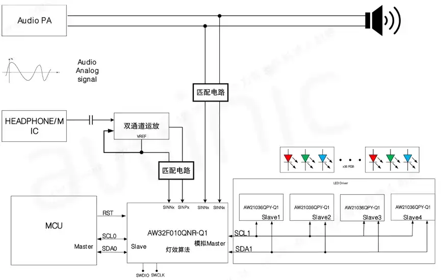 AW32F010QNR-Q1支持多路差分信号输入,提供丰富的拾音方案,对系统和平台带来强大的兼容性。如图2,AW32F010QNR-Q1同时兼容了PA差分输出,MIC输出和HEADPHONE输出,同时只需要一路IIC总线就可以连接4颗AW21036QPY-Q1 芯片驱动,同时控制的led通道数多达144个。