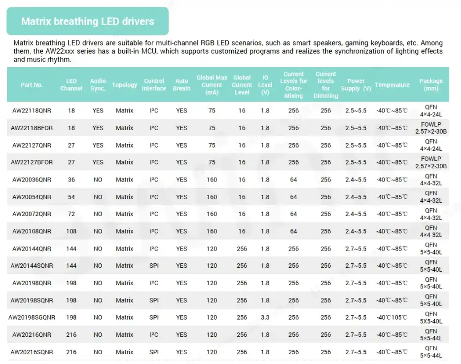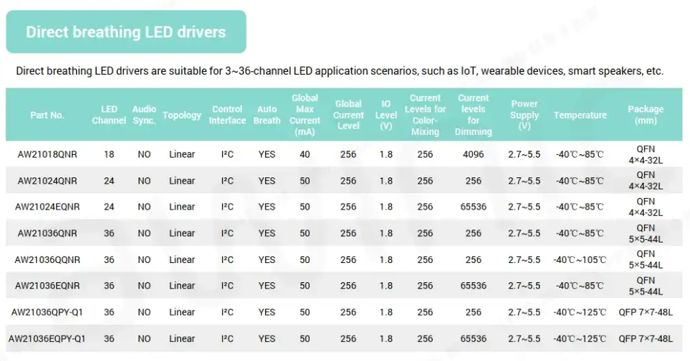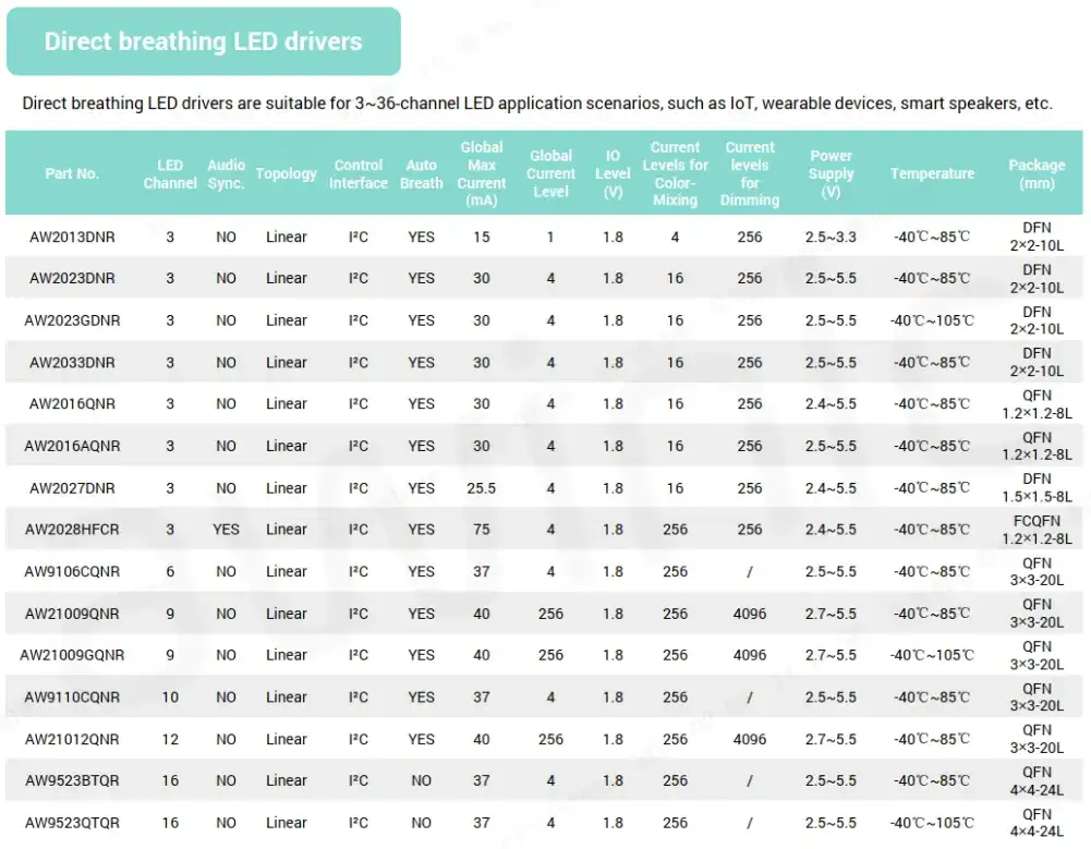 为了满足市场不同客户,不同产品的需求,艾为推出了一系列的呼吸灯驱动产品,包含直驱型和矩阵型的产品,且提供多个型号和封装供选择。