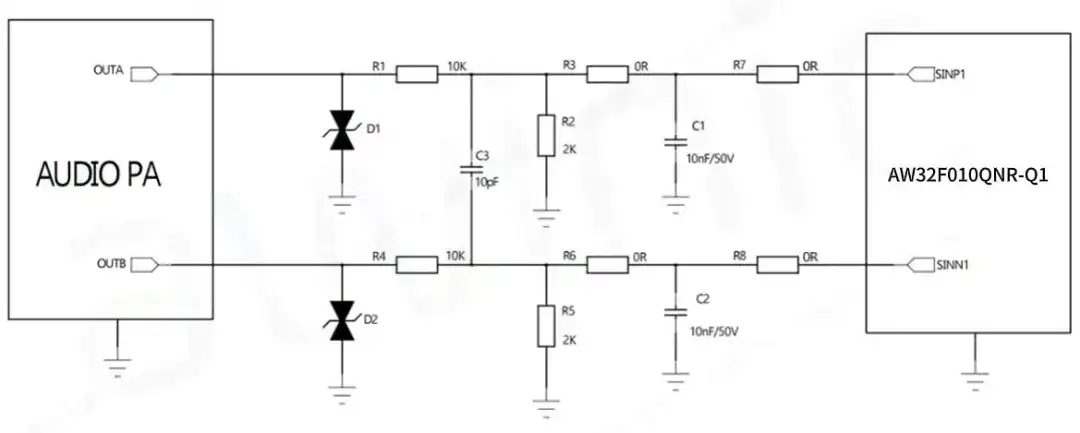 媒体播放功能几乎已经成为了汽车的标准功能,喇叭是汽车媒体播放功能必不可少的电子设备。AW32F010QNR-Q1可以支持从D类,AB类音频放大器的输出信号进行采集,经过电阻分压RC滤波器直接接到AW32F010QNR-Q1的SINNx/SINNPx。