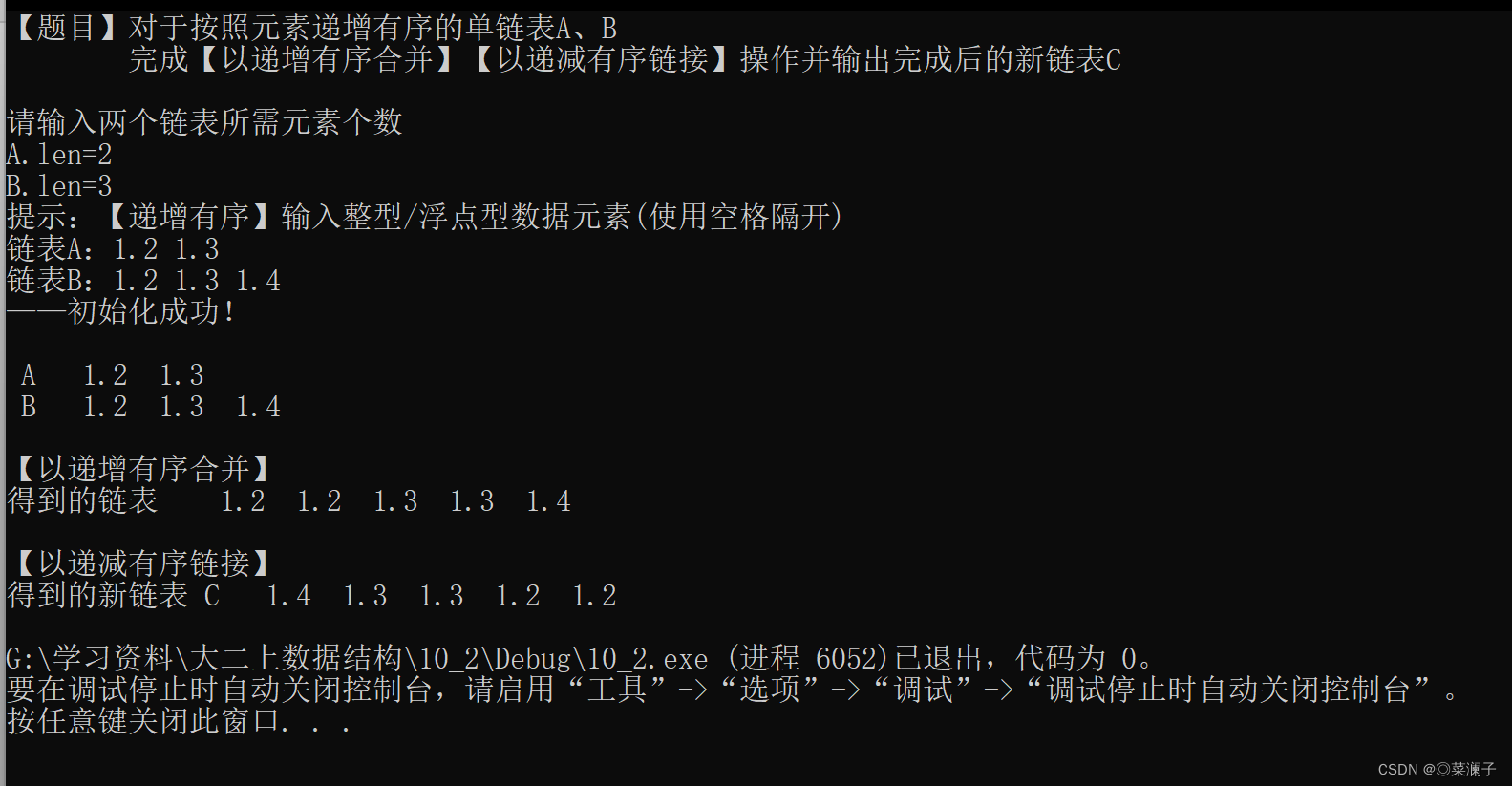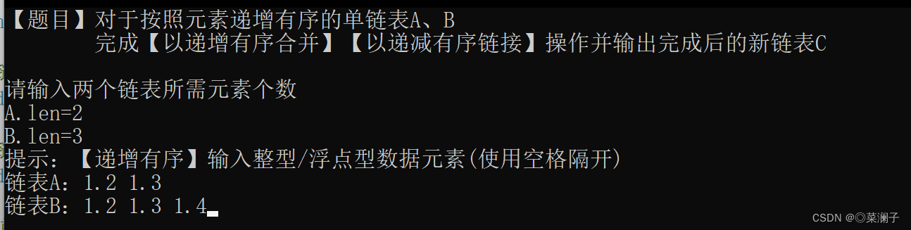 printf("【题目】对于按照元素递增有序的单链表A、B\n 完成【以递增有序合并】【以递减有序链接】操作并输出完成后的新链表C\n\n");