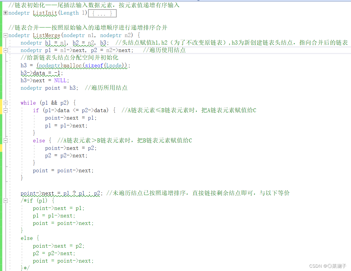 nodeptr h1 = n1, h2 = n2, h3; //头结点赋值h1,h2(为了不改变原链表),h3为新创建链表头结点,指向合并后的链表