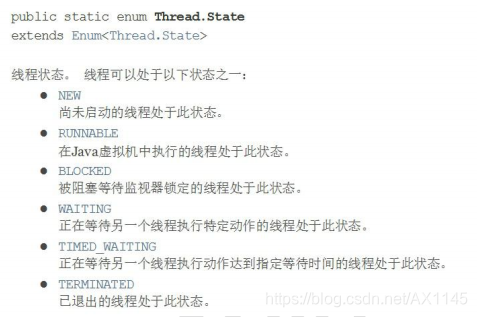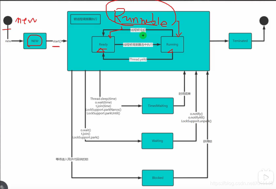 下图解释:创建线程 进入new 状态 执行start方法进入可执行状态runnable,可执行状态又分为两种子状态(准备状态【等待cpu调度】和运行状态)在可执行状态执行不同的方法进入不同的状态【TimedWaiting 超时等待】【Waiting 等待】【Blocked阻塞状态】,当线程执行完毕则从Running状态进入Terminated【终止】状态