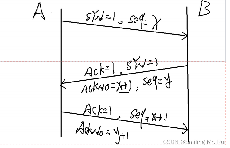 B->A ACK=1,SYN =1,ACKN0 = X+ 1;seq = y