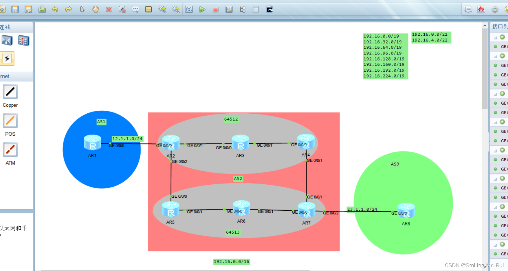 1,R2-R7每台路由器均存在一个环回接口用于建立邻居;同时还存在一个环回来代表连接用户的接口;最终这些连接用户的接口网络需要可以和R1/R8的环回通讯