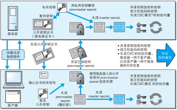 1、https协议需要到ca申请证书,一般免费证书较少,因而需要一定费用。服务端发送证书,也就是公钥私钥中的公钥给客户端,客户端通过该公钥计算得到在本次通信中才使用的pms,传递给服务端,服务端如果能正常解码该消息,则之后的通信都是用该次通信对应的密钥进行