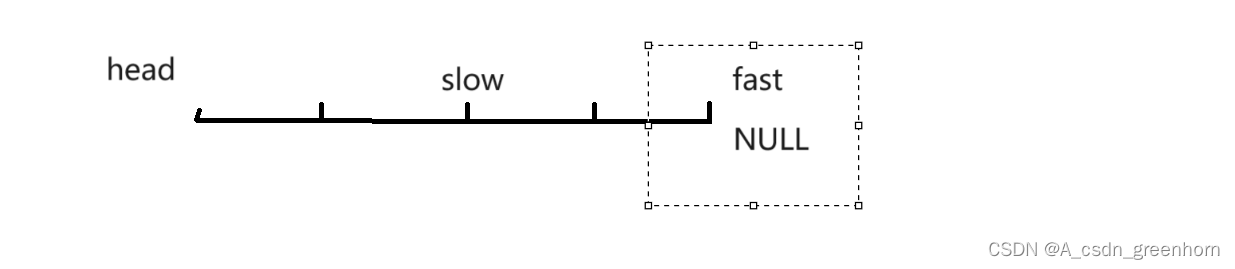 让快慢指针slow 和 fast 都为head,随后将让fast以slow的两倍速度进行移动,具体如下图