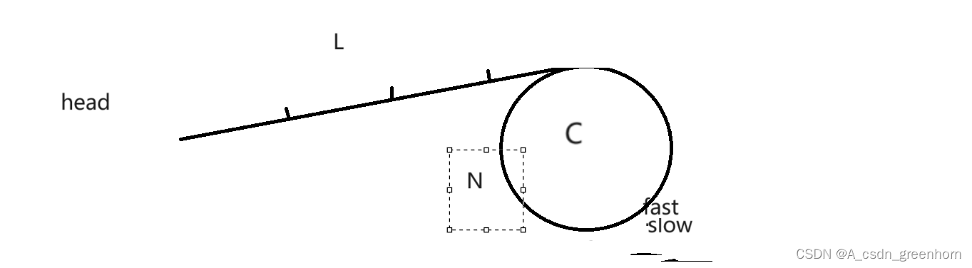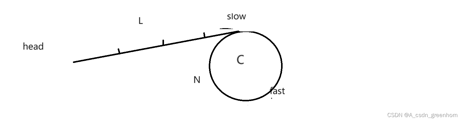 设head到环入口节点位置的距离为L,fast到slow的距离为N,环的长度为C
