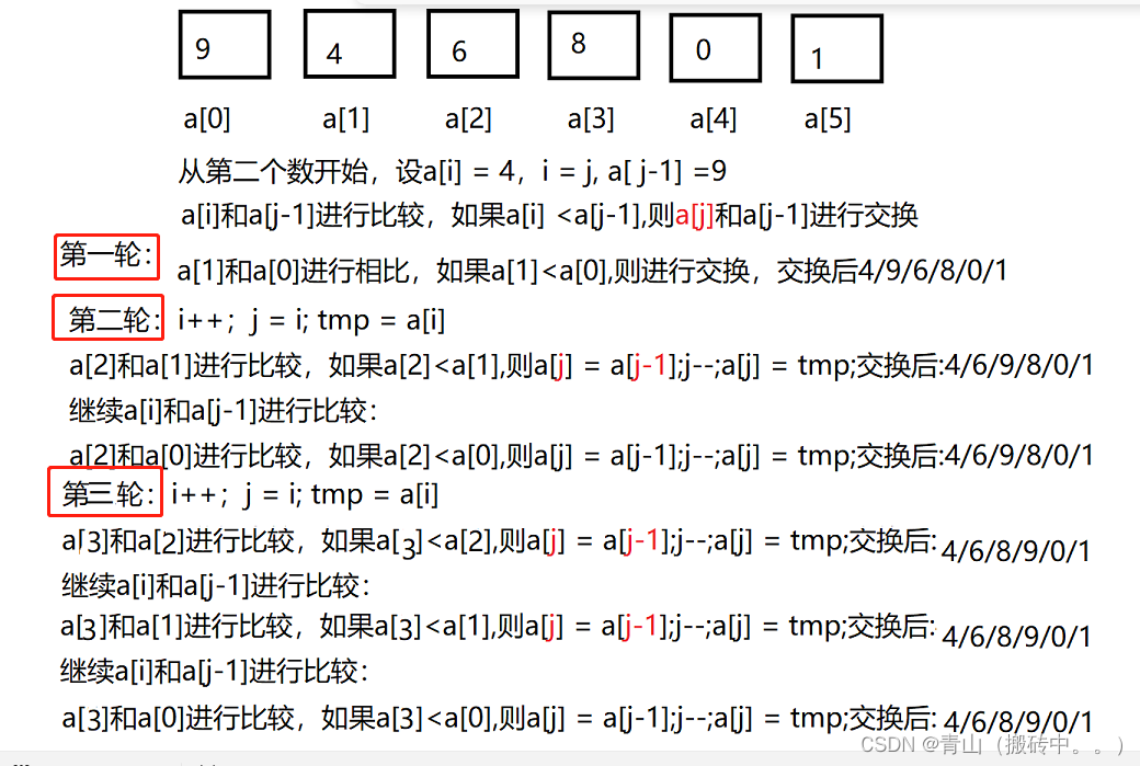 第一轮比较1次,第二轮2次,第三轮3次,第四轮4次,第五轮5次。每次比较结束a[j-1]越界,往前走,for循环里面嵌套while循环
