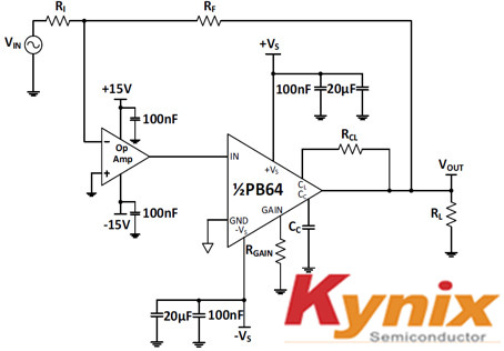 图5:在大多数应用程序中,高电压PB64放大器使用标准的op放大器作为输入缓冲,以确保一致的输入信号场景和负载。(图片来源:凯利讯半导体)