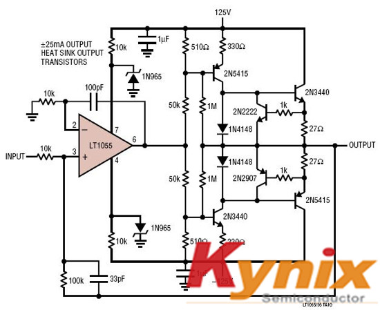 设计者可以选择三种方法来实现高电压的op amp功能。第一种方法是使用标准的低电压op放大器,但在输出中增加了助推器晶体管(图3)。这就产生了将低电压输出转换到更宽、更高的电压范围的效果。在这里,模拟设备LT1055精度,高速运行放大器作为放大器的核心,通过三对PNP/NPN晶体管,输出提升到一个双极的125伏特railto -rail跨度。
