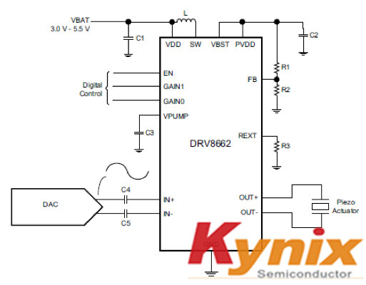 图7:主要针对驱动压电致动器的利基应用触觉设计,DRV8662 IC的德州仪器公司提供高达±200 V个位数的电容性负载电压源使用其内部提高直流变换器。