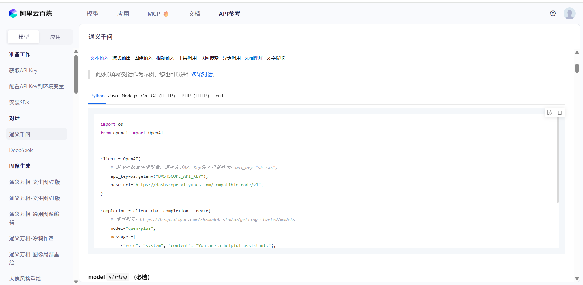 然后点击上方导航栏的API文档,找到左侧的讲话里面的[通义千问] ,复制你需要的编译的文档内容就ok了。