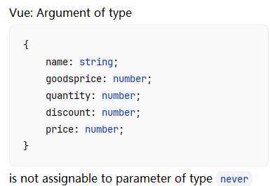 错误原因是 goods_list 被推导为 Ref<never[]>,即没有显式声明 goods_list 的类型,TypeScript 推断它是一个 Ref<never[]>,这个数组的元素类型是 never。你试图向一个 never[] 类型的数组中添加一个对象,TypeScript 就会报错,因为 never 是不可赋值的类型。