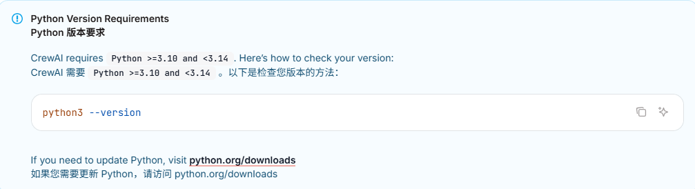 先检查个人的python版本,对于crewai是对python有要求的,目前不支持3.14版本的,和3.10版本以下的版本,如果不是这个区间的请手动降低版本或者更新版本。