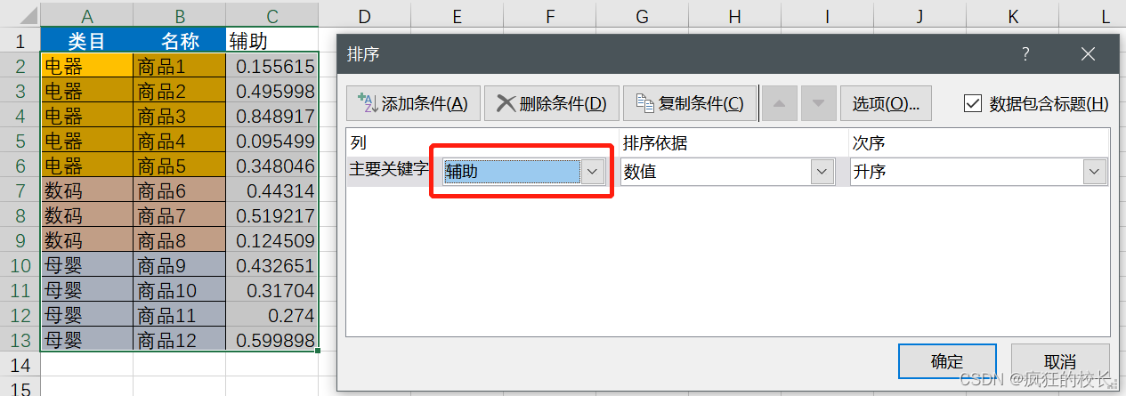 确定之后,根据随机模拟的辅助列的数字进行排序,类目已经被随机打乱,也算是雨露均沾了吧。