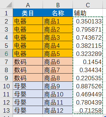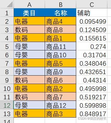 领导交给一个工作,把表里的类目随机打乱,每个类目曝光需要雨露均沾,不要上架时每一屏都是同一个类目的商品。