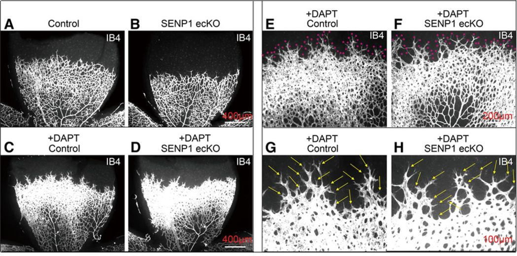 图3. NOTCH反应抑制剂DAPT完全挽救内皮细胞特异性SENP1缺陷(SENP1-ecKO)幼崽视网膜脉管系统的缺陷[8]