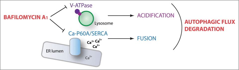 V-ATPase(液泡型 H⁺ -ATP 酶)是一种在真核细胞中广泛存在的大型蛋白复合物,对于细胞内多种生理过程至关重要。Bafilomycin A1(Baf-A1,AbMole,M4953)能够与V-ATPase 复合物结合后,阻碍质子跨膜转运,使得细胞内酸性细胞器(如内体、溶酶体和小泡等)无法获得H⁺离子,导致这些细胞器的pH升高,进而抑制了相关功能。此外,Bafilomycin A1也是一种经典的自噬抑制剂,Bafilomycin A1 能够从多个环节影响细胞自噬。一方面,它通过抑制 V-ATPase,阻止溶酶体的酸化,从而影响自噬体与溶酶体融合后的底物降解过程。另一方面,Bafilomycin A1 还能抑制内质网钙ATP酶Ca-P60A/SERCA,破坏自噬体-溶酶体融合,最终阻碍自噬通量的正常进行[1]。综上,Bafilomycin A1 是一种高效的自噬抑制剂,特别适用于抑制自噬的晚期阶段(图1)。
